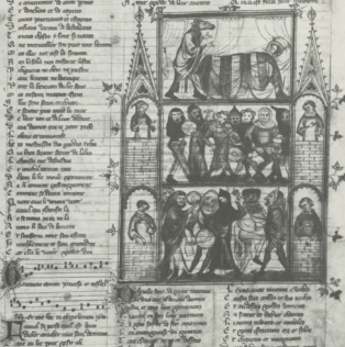 Scenes from the Chalivali is a contemporary reading of the Chalivali (Shivaree) scene in the Roman de Fauvel, a 14th century allegorical political satire. The story is told through the pages of a highly theatrical and musical illuminated manuscript. A shivaree (spelled chalivali in the Roman de Fauvel) is a celebratory and clangorous European wedding tradition which involves shouting and banging on pots and pans while newlyweds enter their bedroom for the first time. The tradition, however, has its roots in a different community practice from the Middle Ages. In the shivaree of the Middle Ages, a group of young men would chastise individuals who did not uphold community values, often pertaining to moral and sexual norms. The Roman de Fauvel, among many of its other subversive elements, turns this ritual on its head — community members and creatures institute a political protest through the guise of a shivaree. The Fauvel verset text from the shivaree scene is a deliberate bastardization of a verse in Deuteronomy 32:20-21, making ambiguous through grammatical trickery the subject of the ritual’s reproach. My text for this piece extends the Fauvel chant with two words, ab inferis (by the people of hell), definitively opting for an alternative and subversive interpretation. The two texts (from Deuteronomy and the Fauvel), and translations, are as follows: